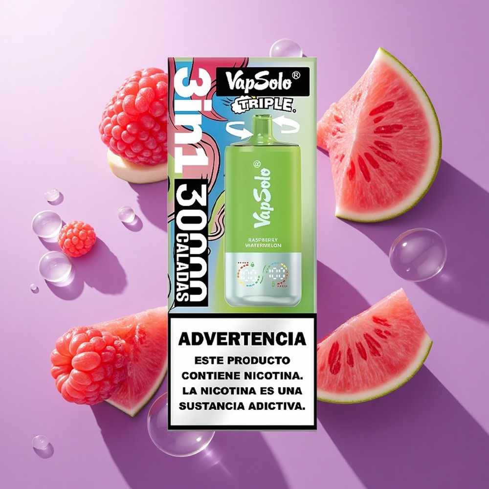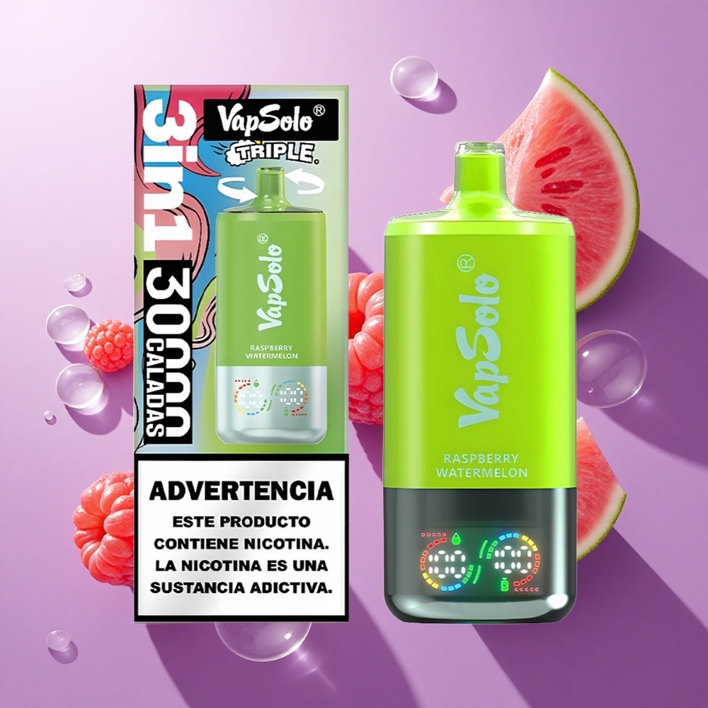 VapSolo Triple 30000 Trekjes Wegwerp Vape Framboos Watermeloen met 40ml E-Liquid, 20 mg/ml of 50 mg/ml Nicotine, Type-C Oplaadpoort